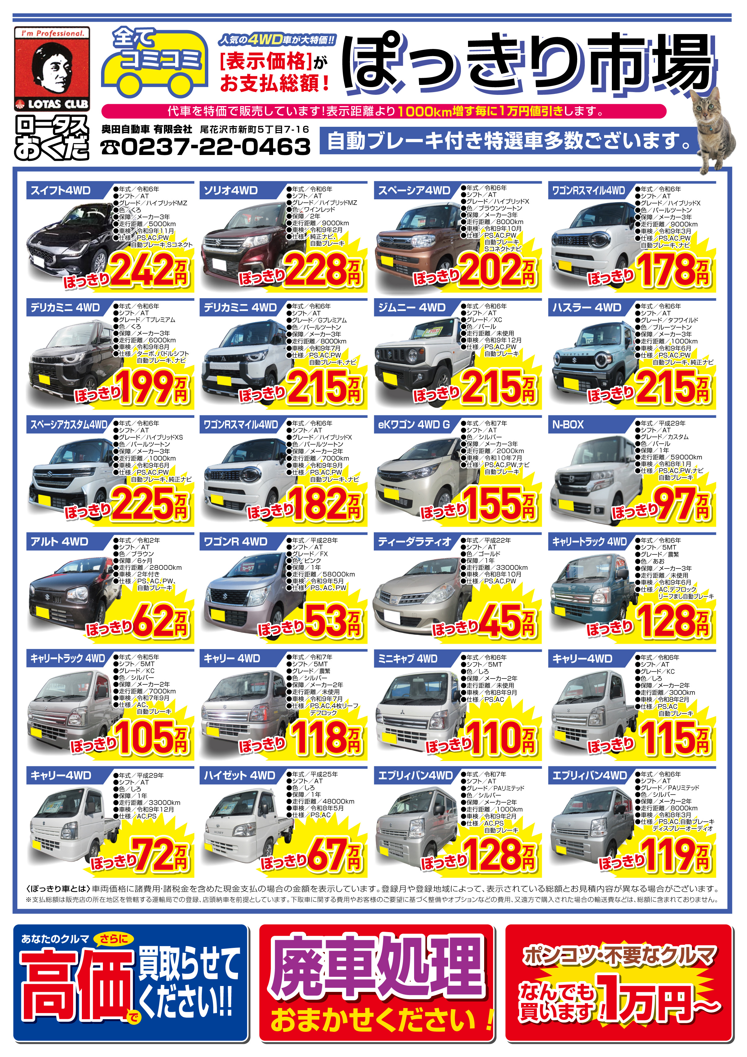 〈ぽっきり車とは〉車両価格に諸費用・諸税金を含めた現金支払いの場合の金額を表示しています。登録月や登録地域によって、表示されている総額とお見積内容が異なる場合がございます。※支払総額は販売店の所在地区を管轄する陸運局での登録、店頭納車を前提としています。下取車に関する費用やお客様のご要望に基づく整備やオプションなどの費用、又遠方で購入された場合の輸送費などは総額に含まれておりません。